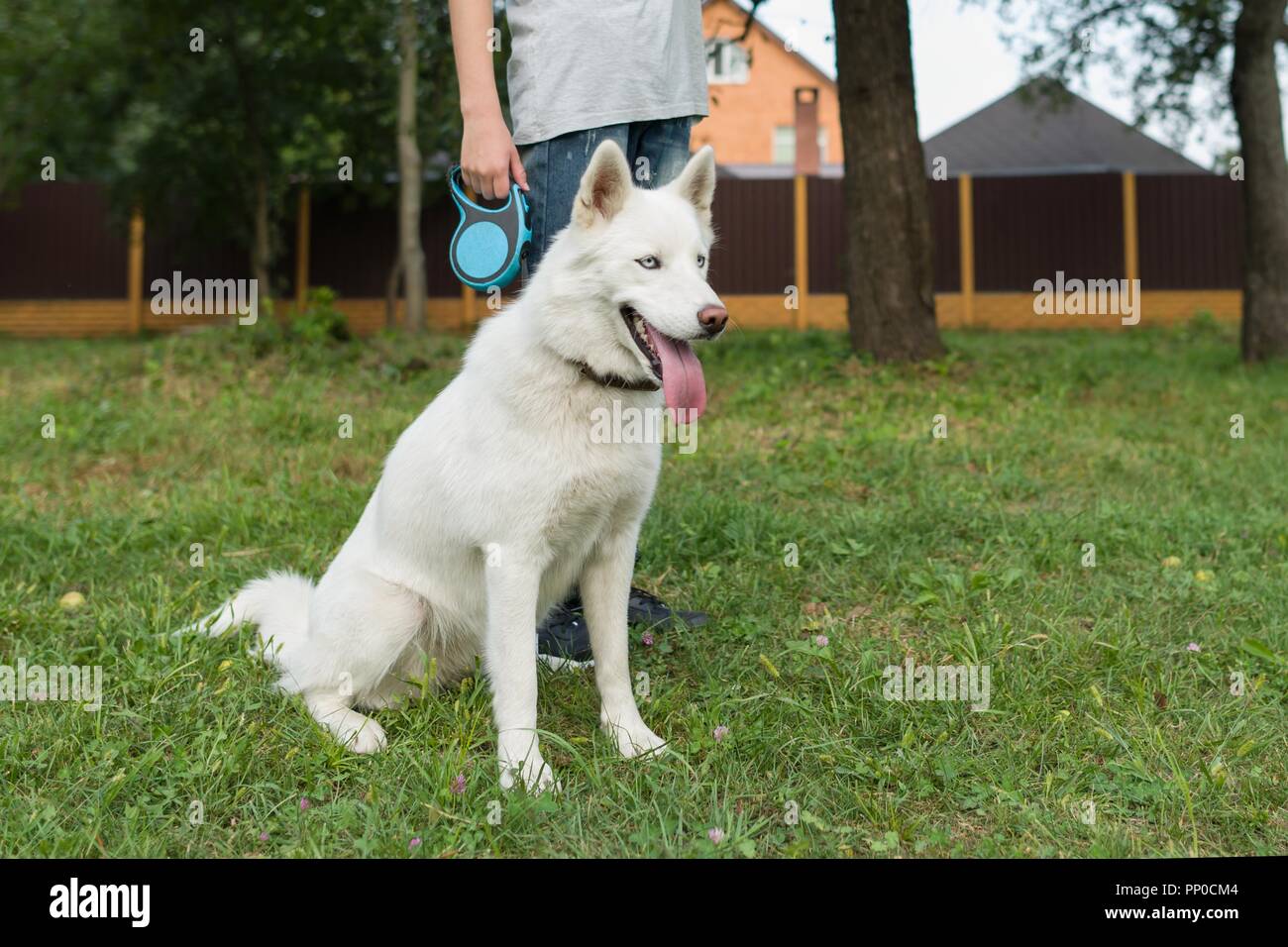 Husky Dog Of White Color With Its Owner Sits On The Grass Stock Photo Alamy